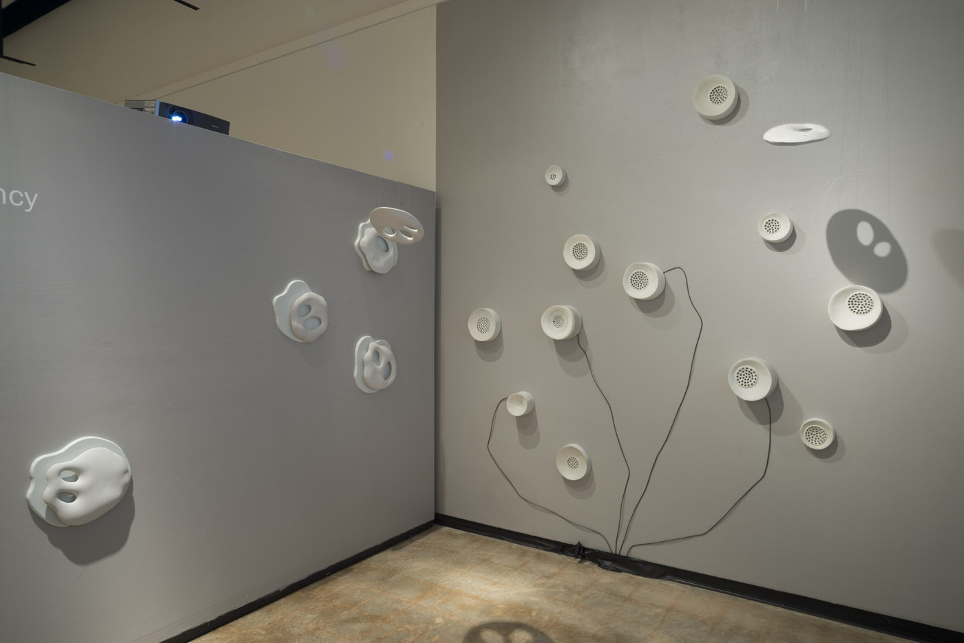 awe/agency. MFA Thesis Exhibition. Porcelain, Stoneware, wood, paint, video projection, audio, monofilament. 10 ft. x 25 ft. x 14 ft. area installed. 2014.